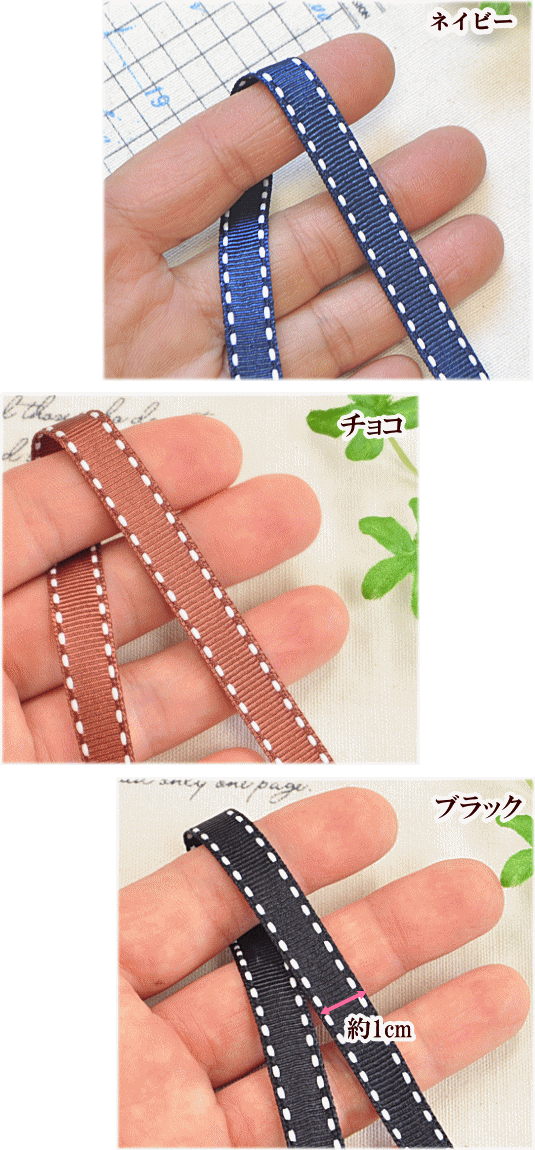 (例:1Mを5枚に分けて、1M・2Mを1枚ずつ、など)新色追加 ステッチのグログランリボン 全3色 約10mm幅 5ヤードカット両サイドに白のステッチ入りのグログランリボン★