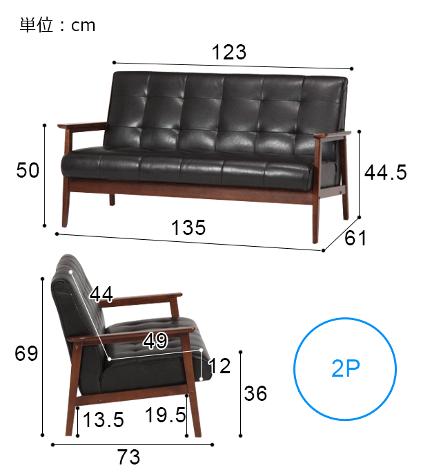 サイズ 全体/幅135×奥行73×高さ69cm 座面/幅123×奥行49×高さ36cm 組立時間 約30〜40分 材質 【PVCダークブラウン】 張地/PUレザー 肘掛・脚部/天然木(ラバーウッド) 中材/ウェービングベルト、ウレタンフォーム 【ファブリックグリーン】 張地/ポリエステル 肘掛・脚部/天然木(ラバーウッド) 中材/ウェービングベルト、ウレタンフォーム 製造国 マレーシア 備考 お客様組立品 フレームは天然木のため、ひとつひとつ木目が異なります。