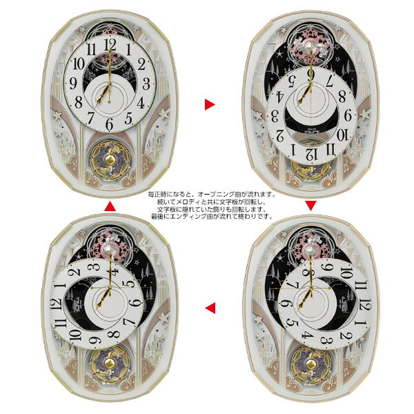 枠材 プラスチック枠(SP/白(白))/風防:ガラス サイズ・重さ 縦 447x横 326x奥行 85mm/約 2.6kg 電池 単1アルカリ乾電池 x 2 機能 ・電波からくり時計 ・下部スワロフスキー・クリスタル回転飾り付 ・毎正時メロディ30曲入り ・自動鳴り止め明暗センサー付 ・オーロラサウンド正時メロディ付 ・ステップ秒針(夜眠る秒針機能付) ・電池交換お知らせ機能 ・モニター付 ・保証期間:メーカー保証1年間 曲目 オーロラサウンド正時メロディ 毎正時に1曲、下記順番でメロディが流れます。